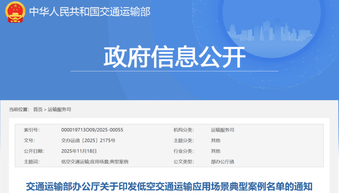 11月18日,为推动低空交通运输应用场景创新发展,交通运输部在各地推荐基础上,梳理遴选了23个低空交通运输应用场景典型案例。全文如下: