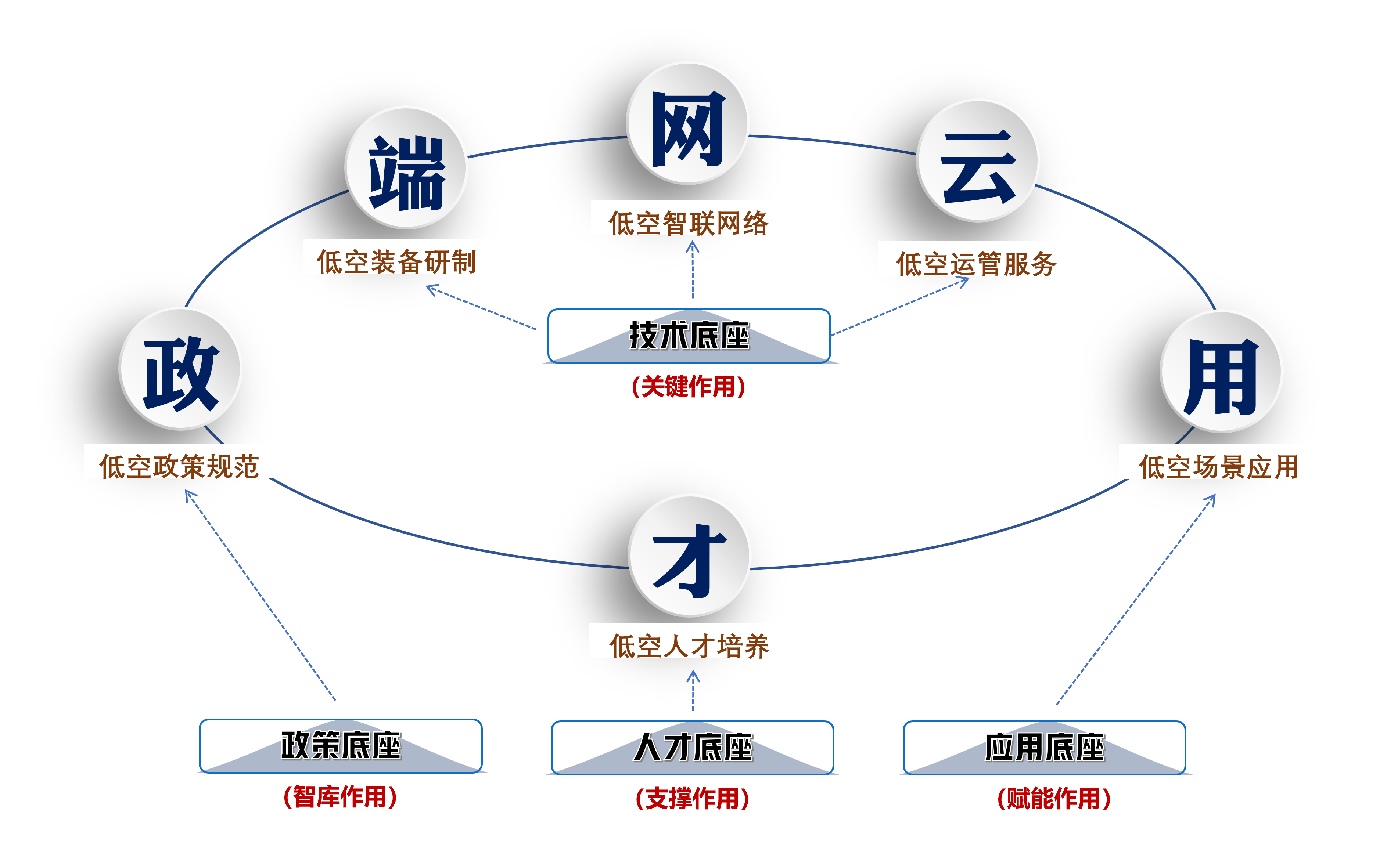南京航空航天大学具有全学科赋能低空经济创新发展的独特优势,也是国内较早发力低空经济创新发展的高校。南航完整地凝练出了低空经济创新发展的六大要素(“政、端、网、云、用、才”)和四大底座(政策底座、技术底座、应用底座、人才底座),提出了构建“政、端、网、云、用、才”六位一体低空经济创新发展生态体系的主张。